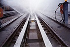高速動(dòng)車組列車在高速行駛中帶起的雪花結(jié)成了冰,附著在列車地盤(pán)上,這些冰層會(huì)影響機(jī)械師對(duì)列車地盤(pán)的檢查,對(duì)行車安全帶來(lái)隱患。因此在檢修前,機(jī)械師們先要把列車地盤(pán)和輪軸上的冰清除干凈。這些冰大多聚集在地盤(pán)零件的空隙里,凍的非常結(jié)實(shí),要想把它們處理干凈,傳統(tǒng)的方法是用特制的工具,一點(diǎn)點(diǎn)往下鏟。為此,北京德高潔清潔設(shè)備有限公司組織技術(shù)力量,研發(fā)了一款全自動(dòng)高速動(dòng)車組列車底盤(pán)、輪軸除冰系統(tǒng)。